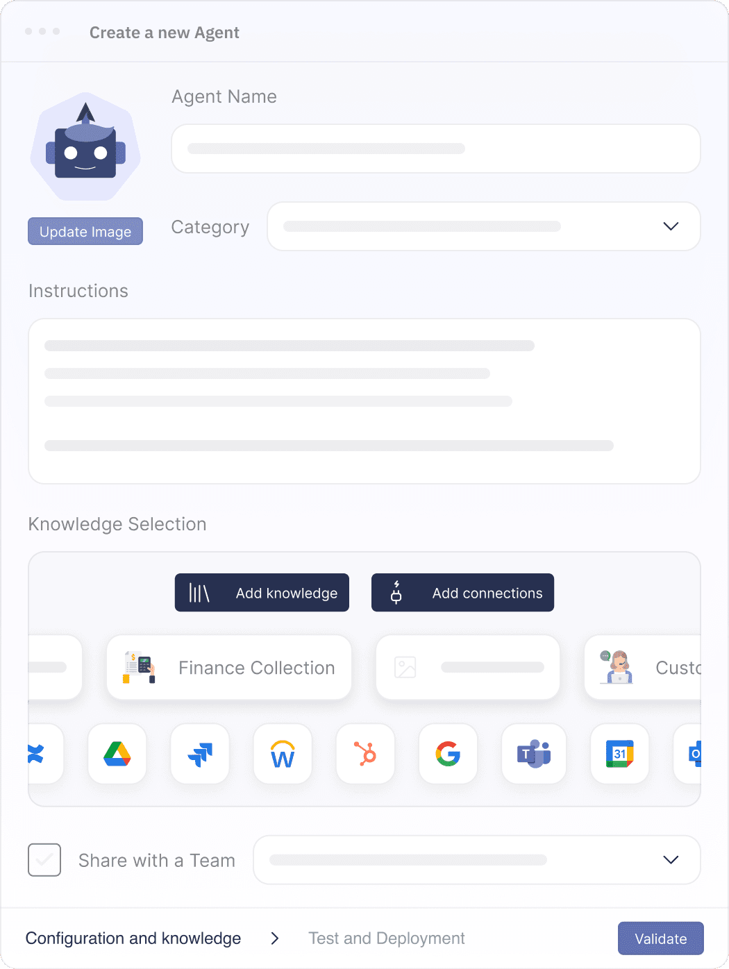 Organize your agents, knowledge, and workflows in dedicated team spaces. Structure everything by department (Sales, HR, Finance, Ops) so each team works with the right tools, the right context, and a clean interface.